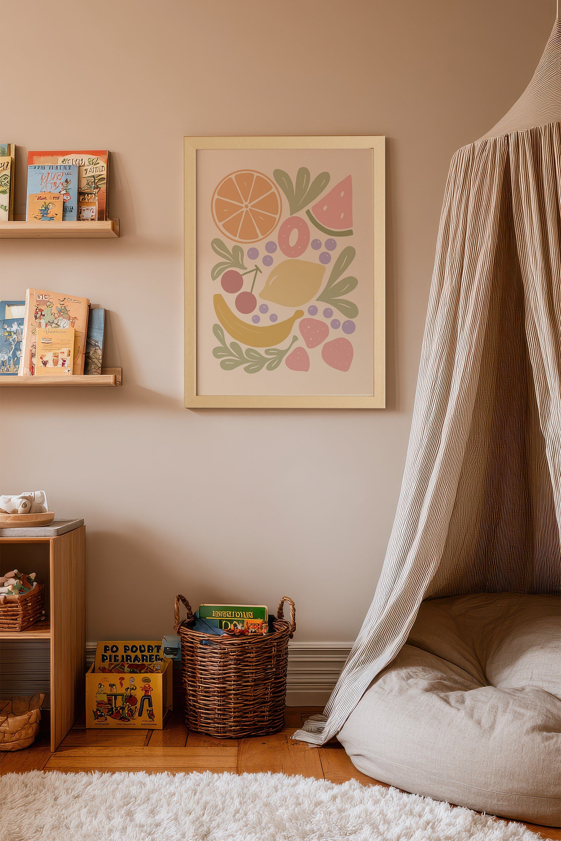 Apportez une touche fraîche et vitaminée à la chambre de votre enfant avec Fruits Pastel. Cette composition joyeuse met en valeur des fruits variés — orange, melon d’eau, citron, banane, cerises, fraises et petits fruits — dans une palette douce et apaisante. Imprimée sur toile rigide de haute qualité, elle conserve toute sa luminosité et son charme au fil des années. Le cadre en bois complète parfaitement l’esprit naturel et chaleureux de l’illustration. Idéale pour un décor enfantin coloré et harmonieux.